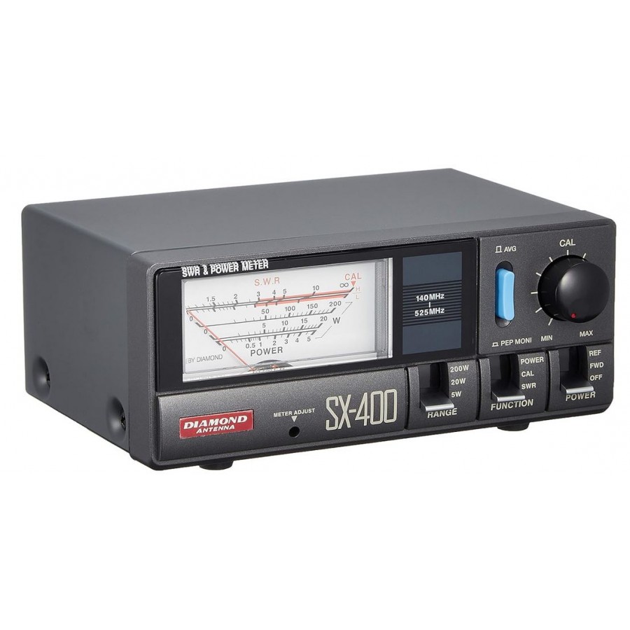 Η Diamond SX-400 είναι ένα οπίσθιο φωτιζόμενο SWR/Wattmeter που καλύπτει 140-525 MHz. Ο μετρητής διαβάζει τη μέγιστη ή τη μέση ισχύ και μπορεί να εναλλάσσεται για ανάγνωση ισχύος προς τα εμπρός, αντίστροφης ισχύος ή SWR και έχει τρία εύρη ισχύος: 5, 20 και 200 Watt, σε πλήρη κλίμακα. Εάν χρησιμοποιείται οπίσθιος φωτισμός, απαιτείται πηγή 13,8 VDC. Ο μετρητής παρέχεται με καλώδιο ρεύματος DC.