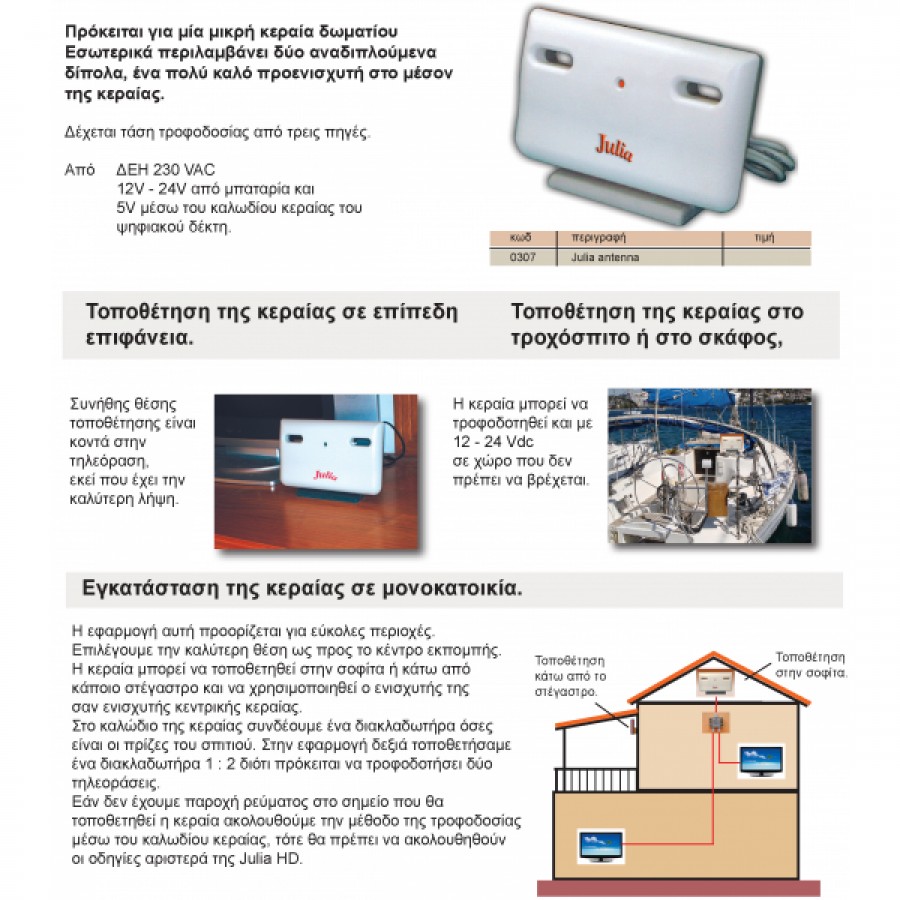 Πρόκειται για μία μικρή κεραία δωματίου, η οποία περιλαμβάνει δύο αναδιπλούμενα δίπολα και ένα πολύ καλό προενισχυτή στο μέσον της κεραίας.