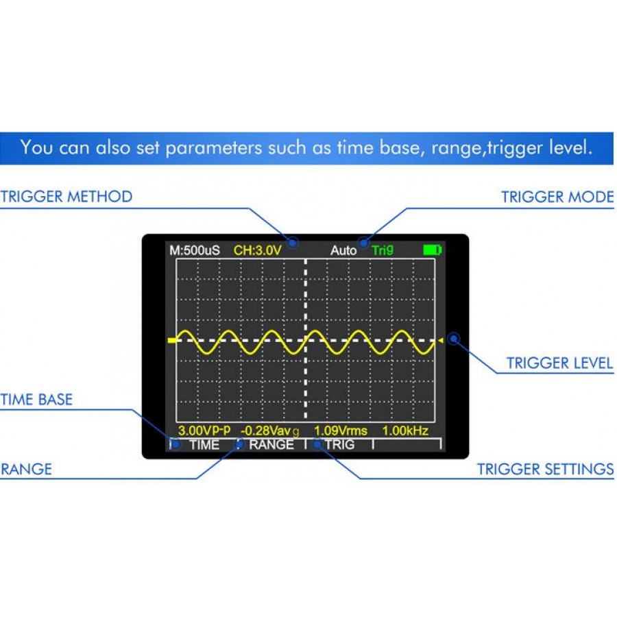 Δευτερεύουσα οθόνη λειτουργίας παλμογράφου: VP-P, μέση τιμή, πραγματική τιμή, συχνότητα, βάση χρόνου, πλάτος
